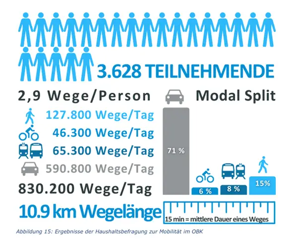 Die im Ergebnisbericht der Haushaltsbefragung festgestellte IST-Mobilität erlaubt eine Ausgangsbilanzierung der verkehrlichen Emissions- und Luftschadstoff-Auswirkungen. Der sehr hohe Anteil des motorisierten Individualverkehrs (MIV) auch bei Kurzstrecken ergibt ein hohes Potenzial zum Umstieg auf eine aktive Mobilität: Zu Fuß, mit dem Bus oder mit dem Fahrrad. Bei einer durchschnittlich zurückgelegten Wegstrecke von 10,9 km werden heute folgende Verkehrsmittel genutzt (Personen-km in 2023):